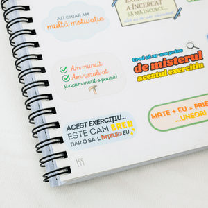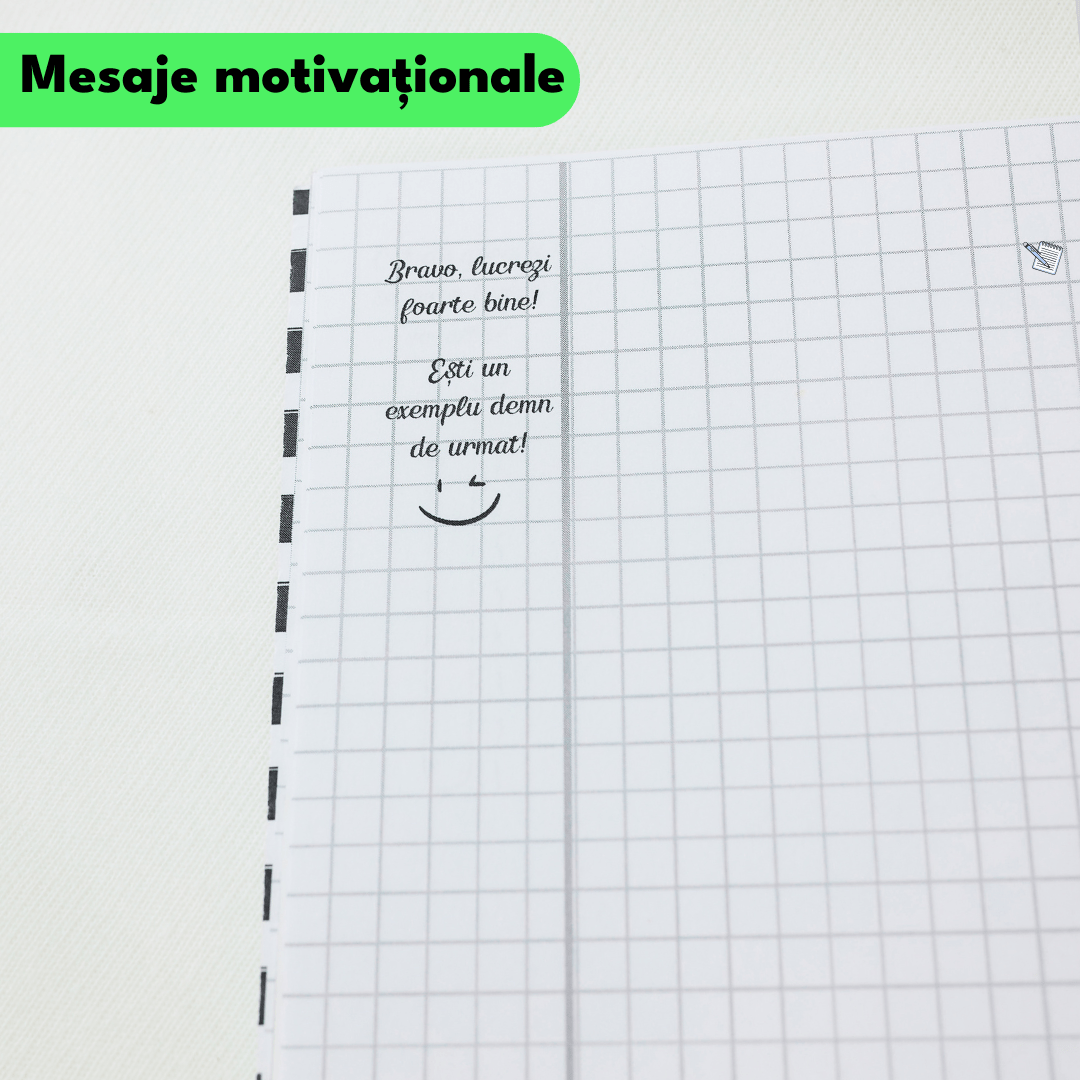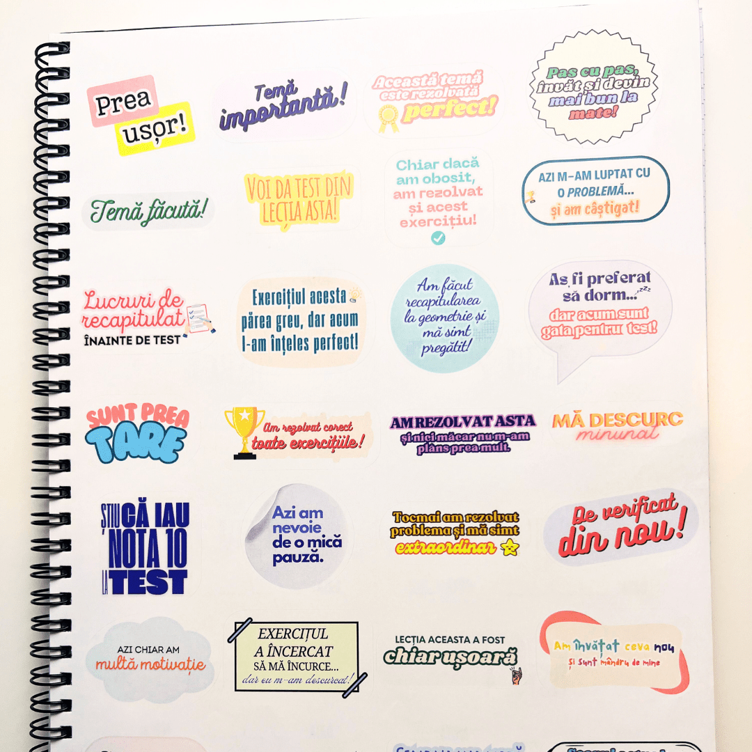 • ✨ MOTIVAȚIE ȘI ECHILIBRU (ANTI-BURNOUT) Învățarea de performanță are nevoie de pauze. Include pagini de colorat pentru relaxare și o foaie întreagă de stickere motivaționale care să îți amintească în fiecare zi: „Pas cu pas, devin mai bun la mate!”