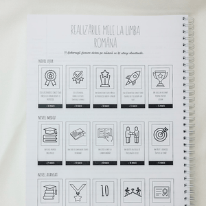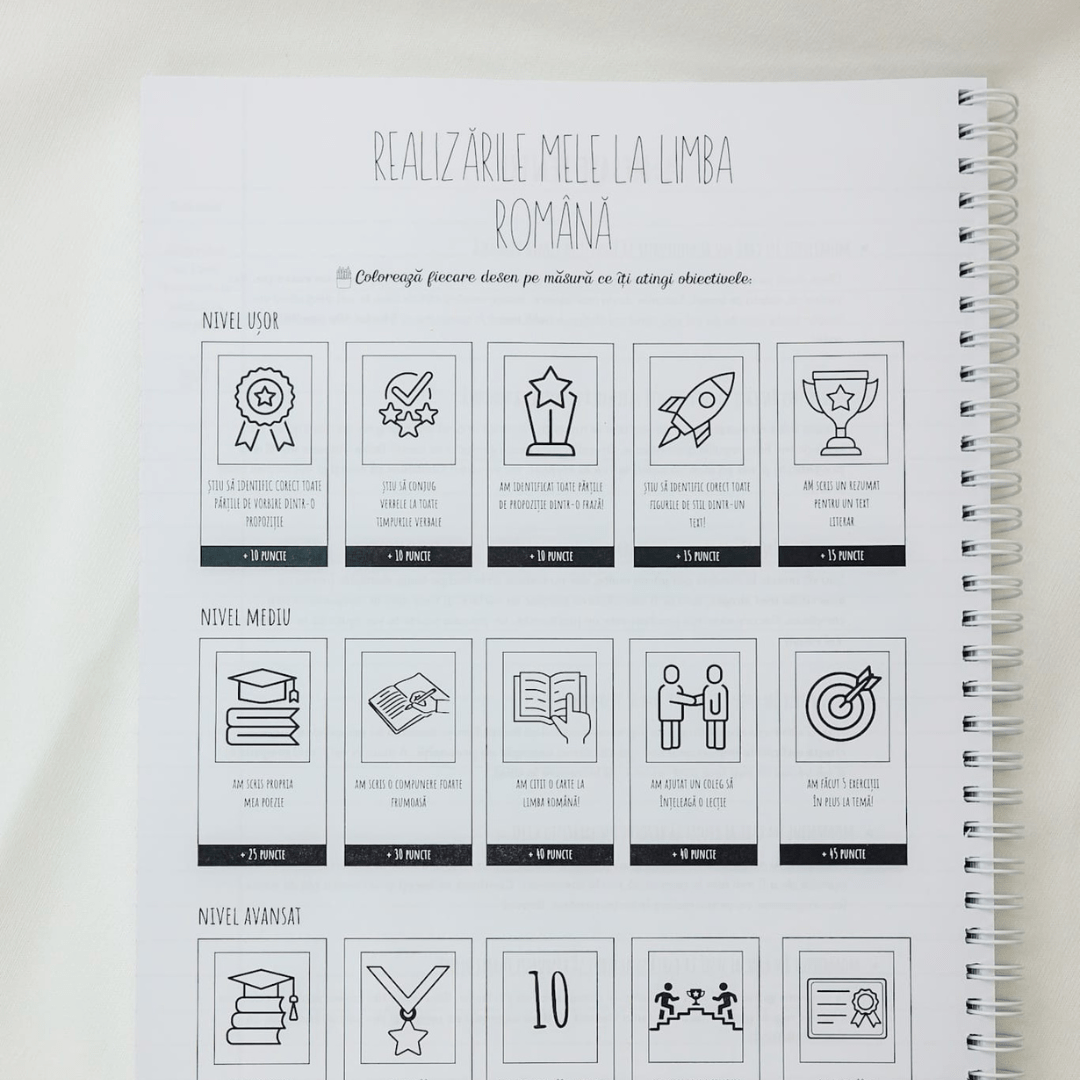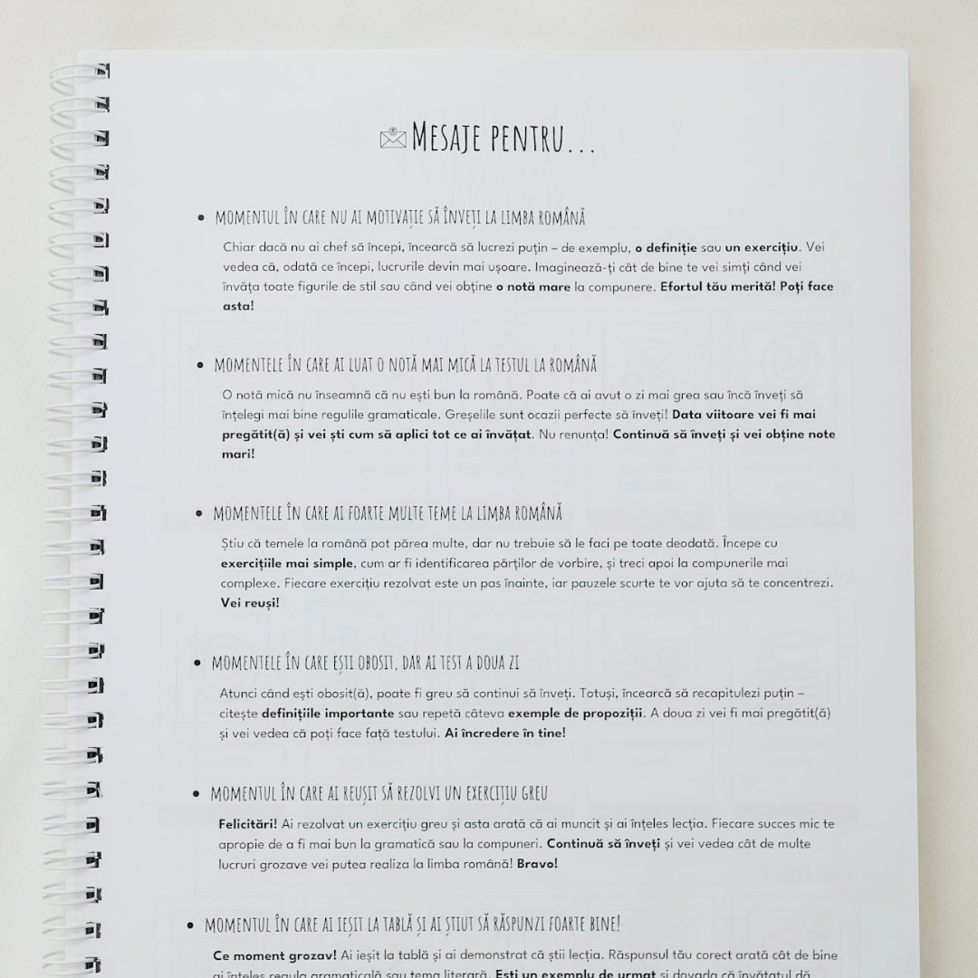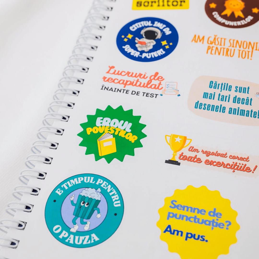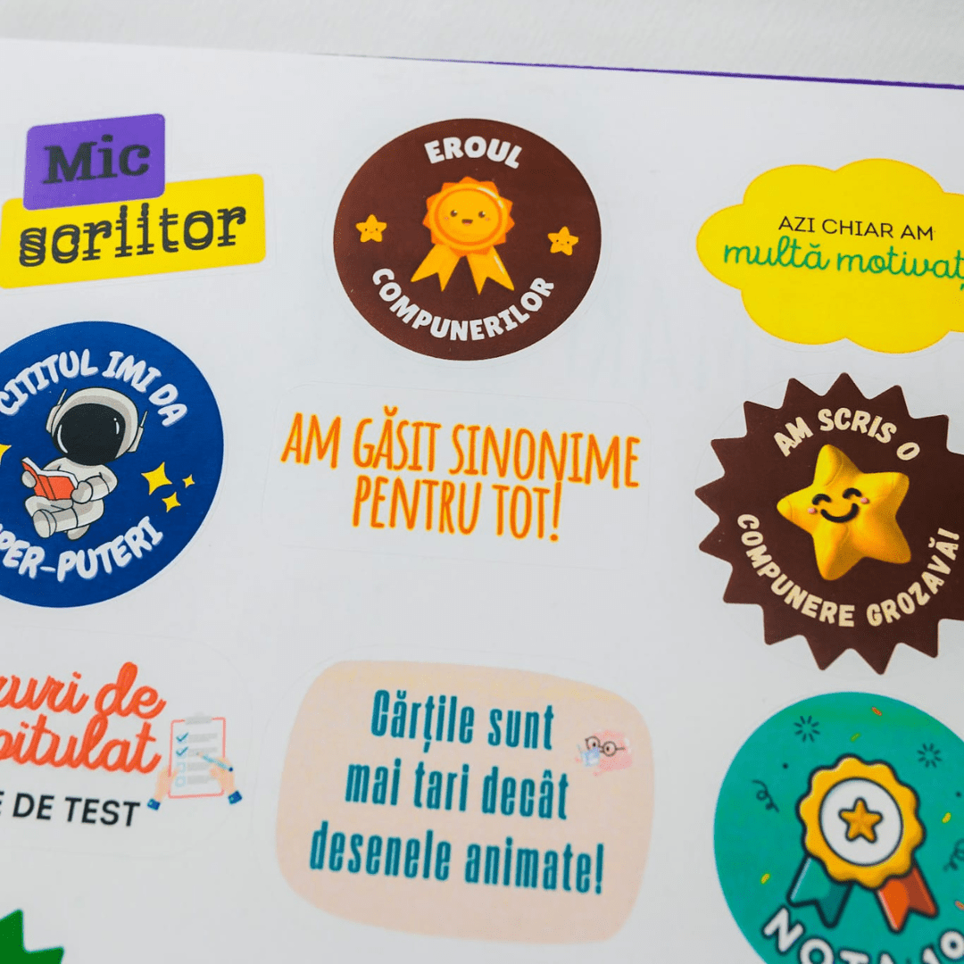 ✨ MOTIVAȚIE ȘI ECHILIBRU (ANTI-STRES) Performanța necesită momente de respiro. Ghidul include pagini de colorat terapeutice pentru pauzele dintre teme și o foaie întreagă de stickere motivaționale care îți amintesc constant că fiecare compunere scrisă te aduce mai aproape de nota 10.