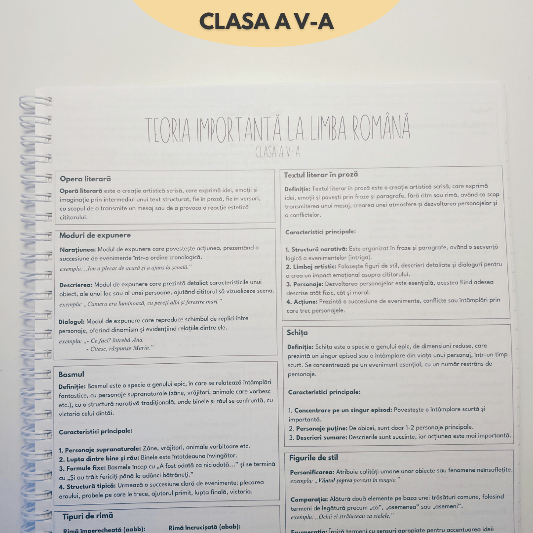 📚 SINTEZA DE AUR (V-VIII) INTEGRATĂ Uită de timpul pierdut copiind definiții interminabile. Ai 18 pagini de Teorie Pură cu toate regulile de gramatică și conceptele de literatură esențiale pentru clasele V-VIII, gata tipărite. Este „busola” ta educațională care te ghidează de la primele analize literare până la eseul de la Evaluarea Națională.